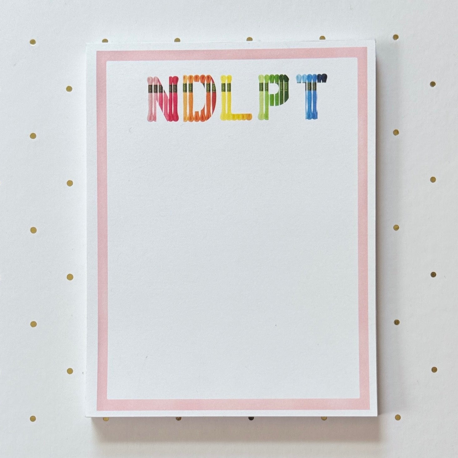 Brighten your desk with a cheerful nod to your favorite passion. This vibrant 50-page notepad features “NDLPT” in a custom rainbow thread typeface ~ an original Joli Point design you won’t find anywhere else!